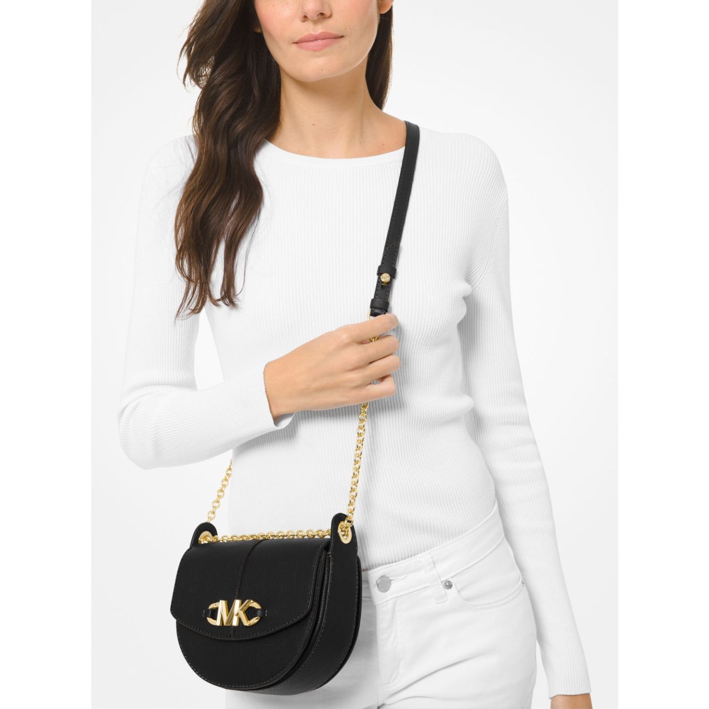 Thoughtful design details create a new and utterly luxe take on chic style. Crafted from pebbled leather, this Izzy crossbody bag features contrast topstitching, a chain-trimmed strap and our high-shine logo initials. It opens to a petite interior designed with a slip pocket and card slots for easy access to your essentials. Style it with the season’s printed blouses and cropped denim.