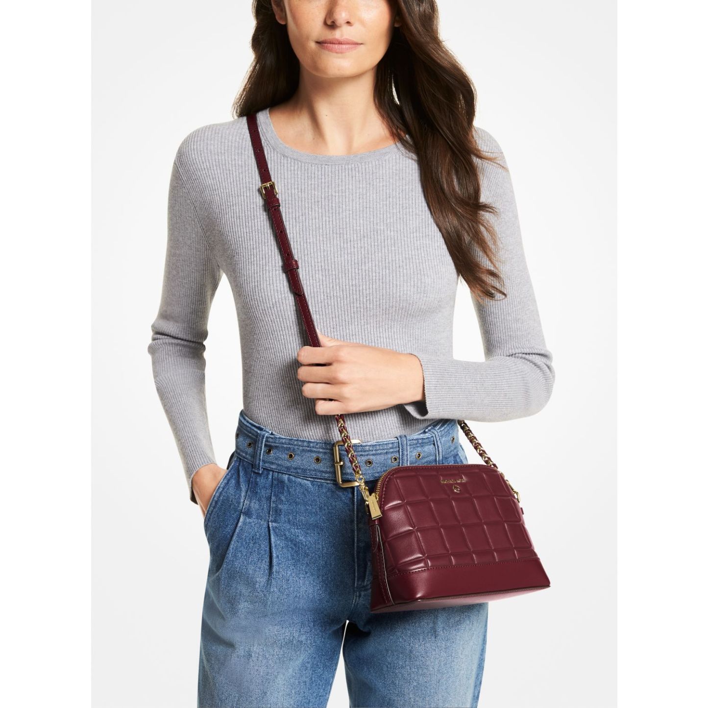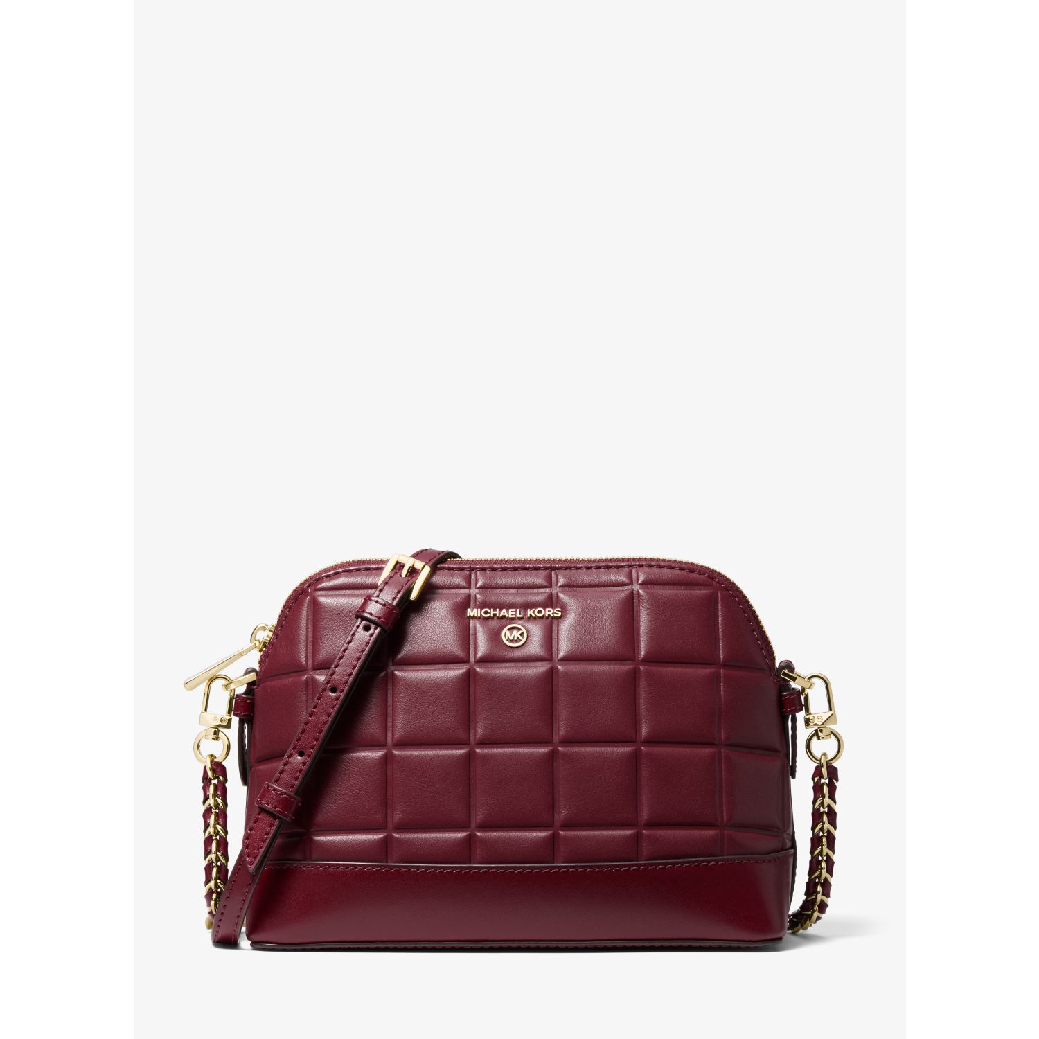 This crossbody bag boasts luxe appeal in quilted leather that's accented with gilded hardware. Rendered in a structured dome shape, it features an adjustable chain-trimmed strap and a convenient back slip pocket.